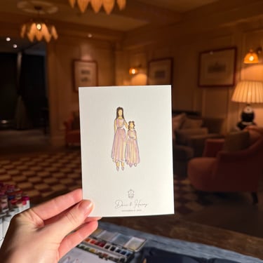 Each A6 illustration is hand-painted, glittered and packaged on the day, ready for your guests to take home at the end of the night.